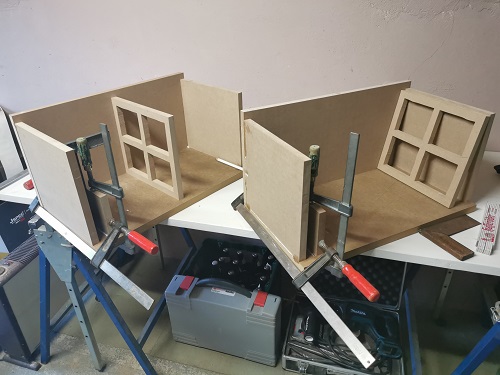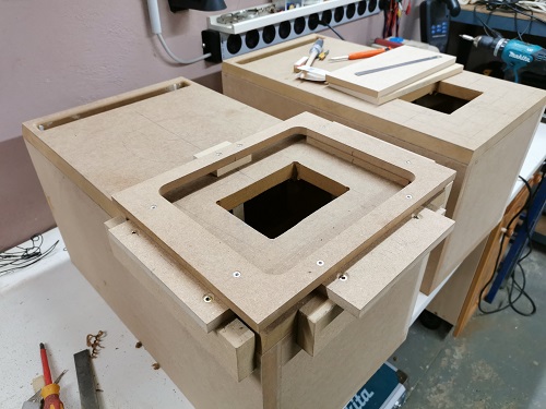 Damit ich die Hochtonhörner ordentlich versenken kann, habe ich eine Frässchablone angefertigt. Die hat auch Anschläge an 3 Seiten und passt so saugend auf beide Gehäuse.![]()