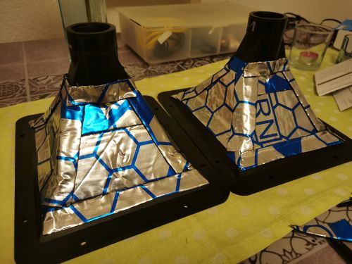 Die Hochtontreiber und die Hörner haben noch Verbesserungspotential. Da gibt es diverse Anleitungen für. Ich habe die rückwärtigen Kammern der Treiber mit Filz ausgekleidet und die Hörner mit Alubutyl beruhigt.![]()
