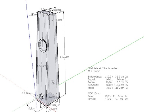 > Vor einiger Zeit flatterte ein günstiges Pärchen Gradient AX-5 ins Haus. Die guten Erfahrungen mit dem AX-8 veranlassten mich dazu, mal etwas mit diesen kleineren Breitbändern zu versuchen. Das Gehäuse ist eine ungefaltete TQWT. So ähnlich gibt es die auch von Udo Wohlgemuth, an der ich mich etwas orientiert habe. So sieht das in Theorie aus:![]()