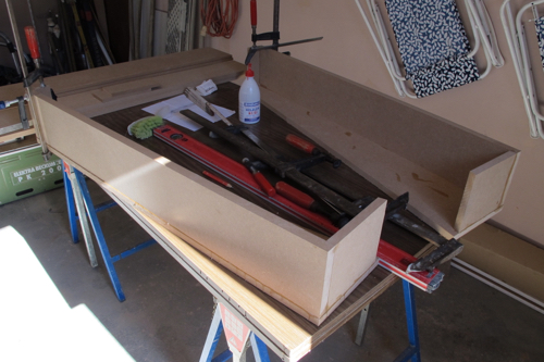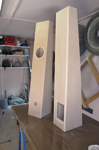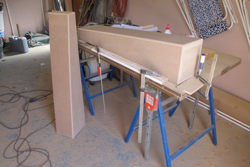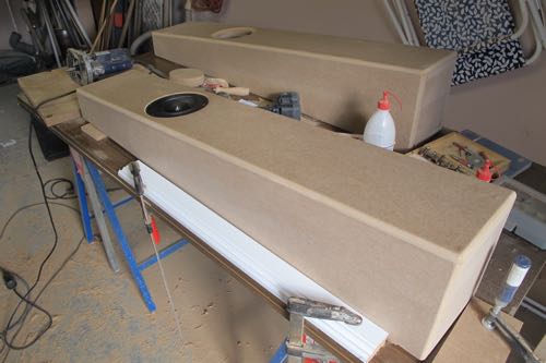 > Der Zuschnitt ist fertig und es geht an den Gehäusebau aus 18mm MDF. Die Front und der Deckel sind mit 12mm MDF aufgedoppelt. Die Kanten erhalten dann 12mm Radien. So vermeide ich Stoßkanten, welche sich unter dem Lack abzeichnen würden. Die Bassreflexrohre aus Pappe werden auf der Front in die hintere Platte eingepasst und dann bündig mit der 12er gefräst.![]()