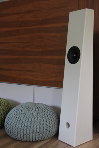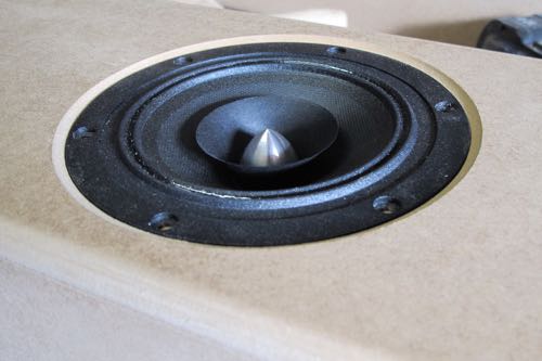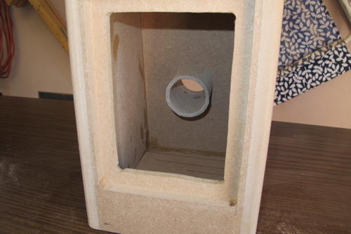 > Fürs Lackieren vorbereitet. Als Terminal wird eine 12mm MDF-Platte eingesetzt, die auch als Träger für das Korrekturnetzwerk dient. Das BR-Rohr ist eine stabile Papprolle, welche in die hintere Frontplatte eingepasst und bündig zur vorderen Platte gefräst wurde. Der Radius gibt einen sauberen Abschluss und verringert Strömungsgeräusche.![]()