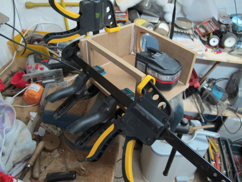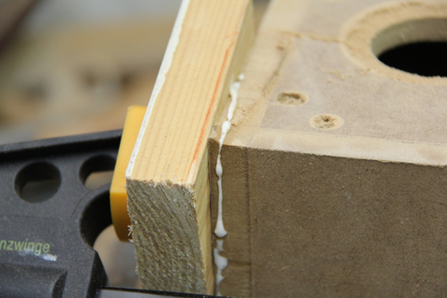 > Da ich nicht so viele kleine Schraubzwingen habe, muss ich nach und nach verleimen. Hinten ist ein Rahmen zur Montage der Rückwand vorgesehen. Die muss demontierbar bleiben..... wie sonst soll denn der Breitbänder dort hinein? ;-)![]()