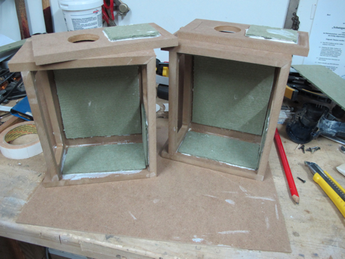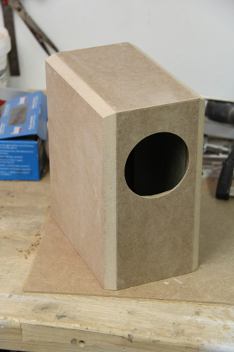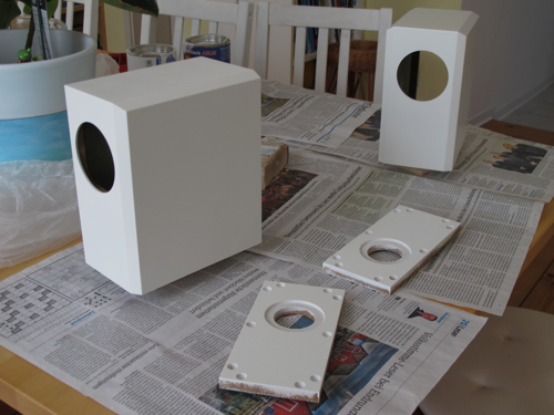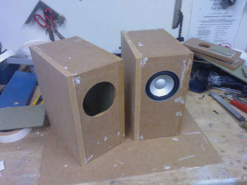 > Kleines Maleur... beim Bündigfräsen hab ich eine Seitenwand "gespaltet". MDF ist auch nicht mehr, was es mal war. Ein wenig Leim dazwischen und ordentlich Spanndruck sollten das Problem beheben. Leide konnte ich nun erst einen der Lautsprecher für`s Lackieren vorbereiten. Egal... mich treibt ja keiner.![]()