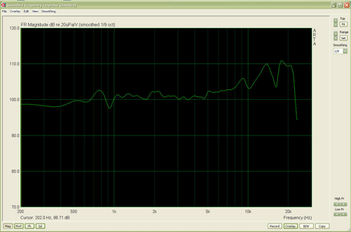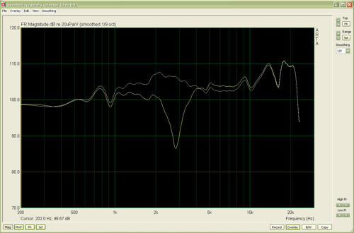 > Und der Sperrkreis. Eine Stufe im Frequenzgang hat mich etwas mehr Zeit gekostet. Die Werte unterscheiden sich von denen, welche man im Internet für den BB3.AL findet. Mein Ergebnis kann sich aber sehen lassen, denke ich. Luftspule 0,18 mH, MKT 10µF, und Widerstand 6,6 Ohm (also 6,8). Auf dem ersten Bild der unbeschaltete Breitbänder und die Wirkung von Spule/Kondensator. Das 2. Bild zeigt das vorläufige Endergebnis. Der Hochtonanstieg wird dann mittels Abhörwinkel "eingestellt".![]()