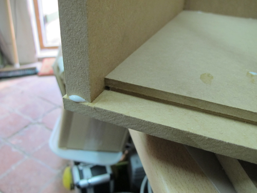 > Nach längerer Pause geht es endlich weiter. Ich möchte natürlich später sichtbare Stöße vermeiden und an den Kanten Radien anbringen. Die sollen aber nicht ganze 18mm groß werden. Deshalb habe ich die Platten abgesetzt und genau so viel Kante stehen lassen, dass mein 9mm Radienfräser sauber bis zur Leimfuge abrunden kann. Erst wollte ich die Absätze fräsen, aber mit der Tischkreissäge geht das auch sehr gut.![]()