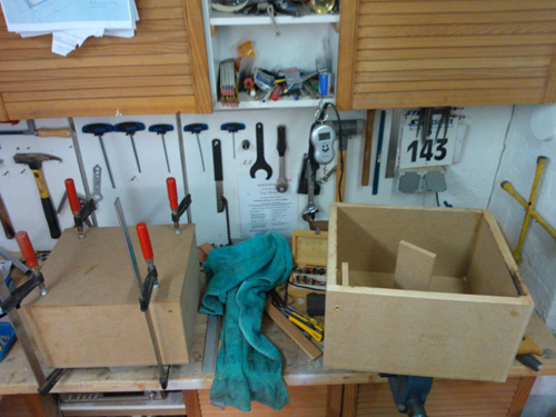 > Die Gehäuse sind im Rohbau fast fertig. Ein Versteifungsbrett habe ich den Seitenwänden gegönnt.![]()