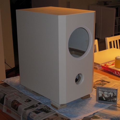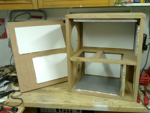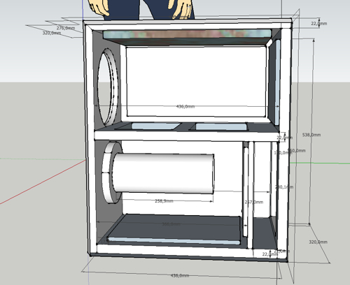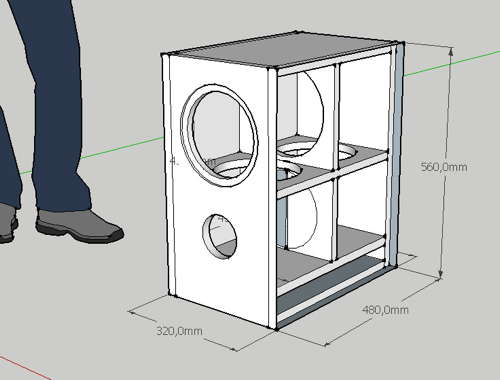 > Einfach mal so wollte ich schon immer einen aktiven Subwoofer bauen. Nun denn.... es wird eine Kiste von etwa 50 Litern Nettovolumen werden. Das gewählte Chassis, ein Visaton GF200, ist im Zulauf. Entwurf ist fertig. Die Kammer unten wird mit Quarzsand gefüllt.![]()