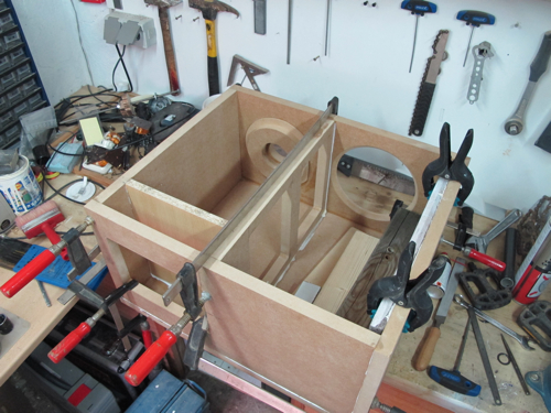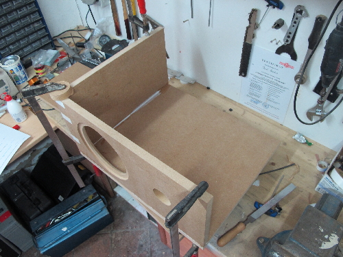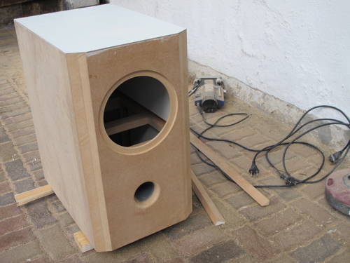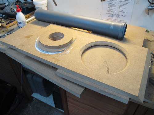 > Hab den Deckel mit der 45°-Fase versehen und die Schallwand gefräst. Hinten sieht man das Abflussrohr liegen. Das wir der BR-Port. Dazu habe ich den Rest vom Tieftönerausschnitt mit einer Bohrung, in die das Rohr saugend passt, versehen und das Teil dann rückseitig auf die Schallwand geleimt. Ich setzte dann das Plastikrohr von innen ein und mit dem Bündig- und Radienfräser wird das ordentlich angepasst. So sieht man keinen Flansch, wie bei herkömmlichen Bassreflexrohren. Als Nebeneffekt ist die Schallwand dort noch massiver.![]()
