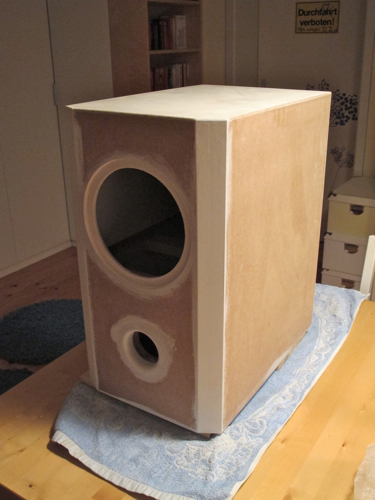 > Schön alle Stöße bündig gefräst und dann den Rest verschliffen. Oben hab ich mich doch gegen die Fasen entschieden und wegen der Plattenstöße eine 3mm Hartfaserplatte aufgeleimt. So passt das besser zu meinen Focal-Lautsprechern.![]()