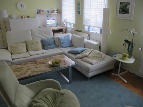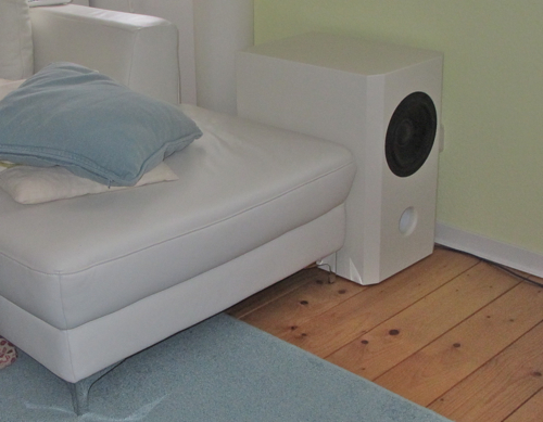 > ... und die Aufstellung im Wohnzimmer. Gedacht ist das Teil, zur Bassunterstützung. Nicht, dass die Focal Temptation keinen Bass machen, aber ich sitze so ziemlich in der Raummitte. Quasi im basstoten Raum. Nach einigen Tests hat sich gezeigt, dass der Subwoofer auf Höhe meiner Hörposition optimal spielt und sich so eine schön gleichmäßige Bassverteilung im Raum ergibt.