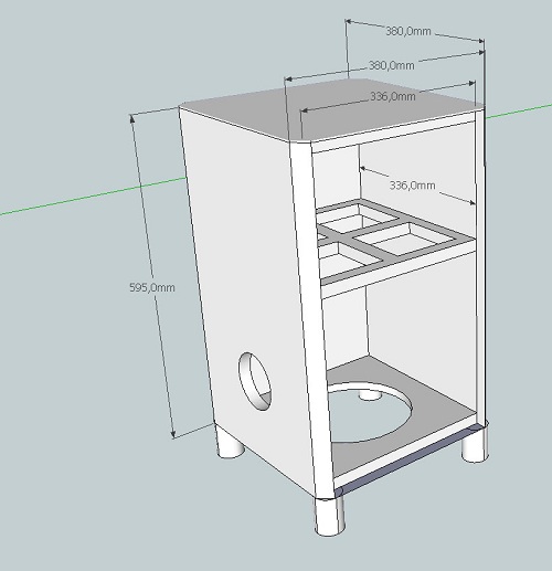 > Ich habe mal wieder Lust einen Subwoofer zu bauen. Der SUB-GF200 war schon ziemlich gut, aber etwas mehr Membranfläche ist sicher nicht zu verachten. Passend dazu haben ich einen Monacor SPH-275C erstanden. Auch der Antrieb soll dieses Mal potenter und mit mehr Möglichkeiten ausfallen. Dazu befindet sich jetzt ein Reckhorn A401 im Zulauf. Der Entwurf ist fertig. Es werden 60 Liter Bassreflex, in Downfire-Anordnung. Das bedeutet, dass das Chassis an der Unterseite sitzt.![]()