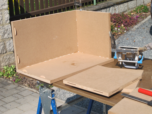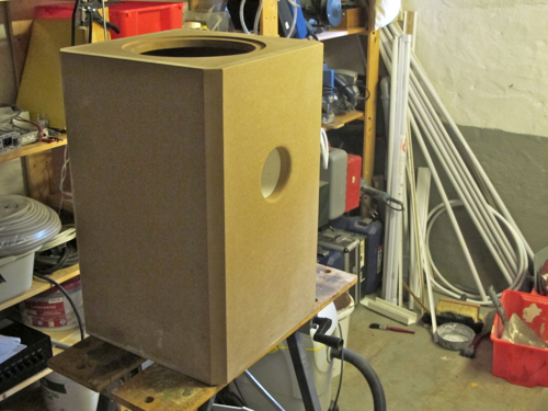 > Die Kiste ist verleimt, Fasen mit der Tischkreissäge gemacht, Ausschnitte für Tieftöner und Bassreflexrohr sind gefräst. Nun kommt die Farbe...![]()