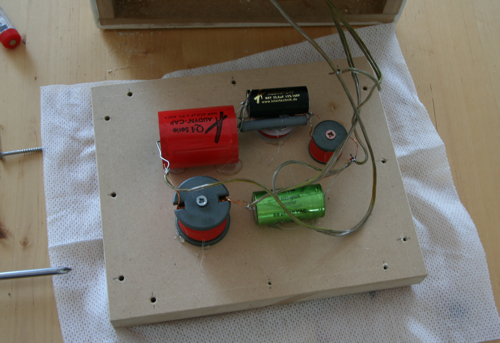 > Die Frequenzweiche baue ich auf die Bodenplatte.![]()