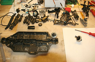 20.09.2009 - Der DB-01 ist angekommen und ich habe mich gleich an die Demontage zur Bestandsaufnahme gemacht. Da sind doch einige Sachen zu richten. Eine Bestellung für Chassiswanne, Karosserie, Antriebsriemen, Diffteile, usw. ist raus.