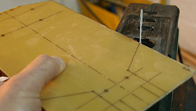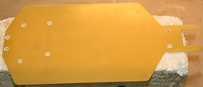 28.10.2008 - Was mich am FF-01 besonders stört, ist die Akkuhalterung, welche nur Sticks zulässt und etwas zu weit hinten positioniert ist. Ähnliche FWD-Chassis, zB. von Yokomo, haben alles an Gewicht möglichst auf der Vorderachse. Was also machen... ein neues Cassis muss her. Das Original aus CFK von Tamiya ist mir zu teuer, also schnell eine Platte GFK für 10 Euro bestellt und los gehts... vermessen, anzeichnen, ausschneiden, bohren und montieren.