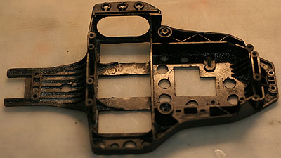 01.08.2008 - Neues (altes) Chassis, neues Glück. Bei ebay ein gebrauchtes, auf Heckantrieb umgebautes TA-02 gekauft, da die Teile zum FF-01 passen... dann halt vorerst als Hecktriebler. Das Chassis sah aber erbärmlich aus...