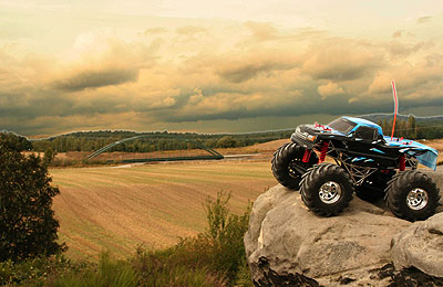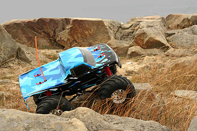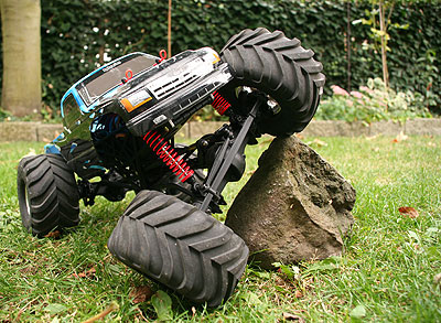 05.09.2009 - Heute war der erste Tag als Wheely King. Ich habe zwar noch nicht viel verändert, aber eigentlich macht sich der King gut in der Felslandschaft. Bisher sind nur die Achsen mit Heißkleber gesperrt und eine längere Übersetzung mittels 96er Hauptzahnrad und 14er Motorritzel eingebaut. Ach so, die Verstärkung zwischen den hinteren Links ist natürlich auch raus, wegen der Verschränkung. Weitere Umbaumaßnahmen folgen.