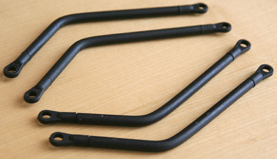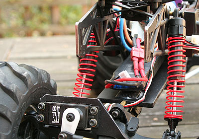 25.09.2009 - Da das mit dem neuen Chassis etwas langwieriger ist, habe ich schon mit anderen Verbesserungen angefangen. Die vorderen upperlinks fungieren jetzt als Akkuplatte für den Lipo. Damit kann dann der originale Akkuschacht demontiert werden. Wieder einige Gramm weniger, oben am Chassis. Ich habe mir Blasen an der Hand vom Reifen beschneiden geholt.