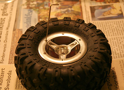 08.10.2009 - Jeah! Ich habe richtige Crawler-Räder! Voll-Alu-Beadlocks vom Reely "Berg" mit Axial 2.2 RockLizards. Blei ist auch drin und pro Rad sind es etwas über 320g. Das wird aber von sicher noch mehr und Luftlöcher müssen auch in die Reifen.